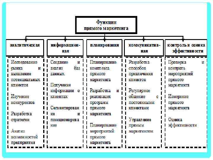 • ФУНКЦИИ: ‑ выявлением потенциальных клиентов; ‑ созданием и анализом баз данных; ‑ получением информации о клиентах; ‑ разработкой способов привлечения клиентов; ‑ планированием мероприятий прямого маркетинга; ‑ регулярным общением с постоянными клиентами; ‑ изучением конкурентов; ‑ разработкой и реализацией программ прямого маркетинга; ‑ управлением прямым маркетингом.