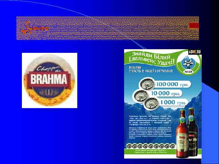 INTERBREW v v v v Пивная компания, зарегистрирована в Бельгии. «Международная компания с региональным подходом к развитию глобального бизнеса пивоварения» Концепция «мирового производителя местных марок» . История – с 1366 г. Более 200 торговых марок: Beck's®, Stella Artois®, Leffe®, Hoegaarden®, Staropramen® and Bass®. Торговые марки «Интербрю» представлены более чем в 120 странах мира, производство – в 21 стране Америки, Европы, АТР. 50 тыс. занятых