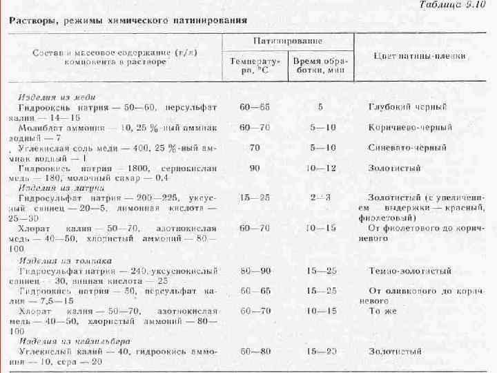 Цвет патины-пленки • Желаемый цвет патины-пленки достигается применением определенного по составу электролита. • Патину цвета от серо-зеленого до темно-зеленого позволяет получить электролит, состоящий из следующих компонентов (г/л): сернокислая медь Cu. SO 4 — 50, хлористый аммоний NН 4 Cl — 28, хлористый натрий Na. Cl — 14, уксусная кислота СН 3 СООН— 12, цинк хлористый Zn. Cl 2 — 6, глицерин — 6. • Электролиз идет в течении 5— 10 мин при плотности тока 0, 3— 0, 5 А/дм 2 и температуре 15— 20 °С.