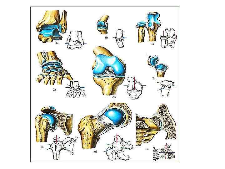 Биомеханическая классификация суставов Взаимосвязь формы сустава и количества возможных осей вращения (возможных движений ). 1. 3 оси вращения - все 3 движения шаровидные плечевой, тазобедренный 2. 2 оси вращения - 2 любых движения - Эллипсовидные - луче-запястный, атлантозатылочный - Седловидные - грудино-ключичный, запястно -пястный 1 -го пальца кисти