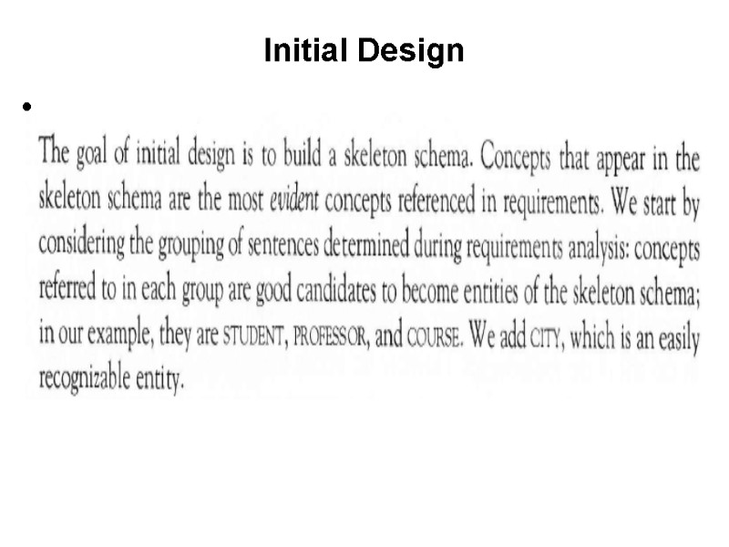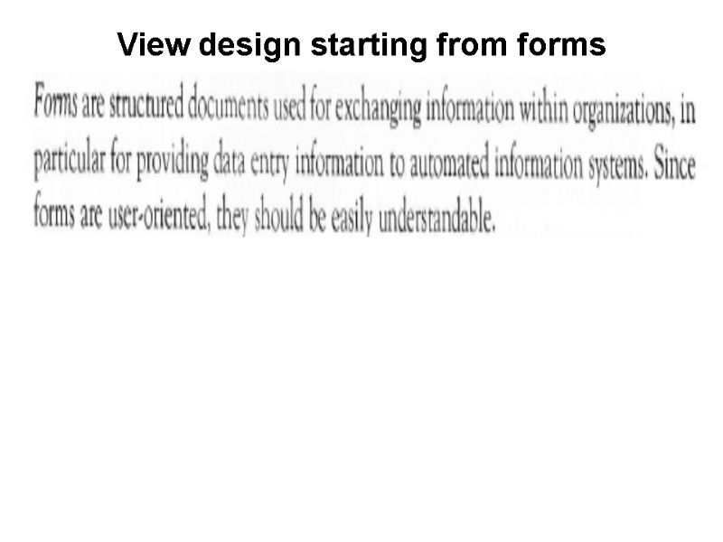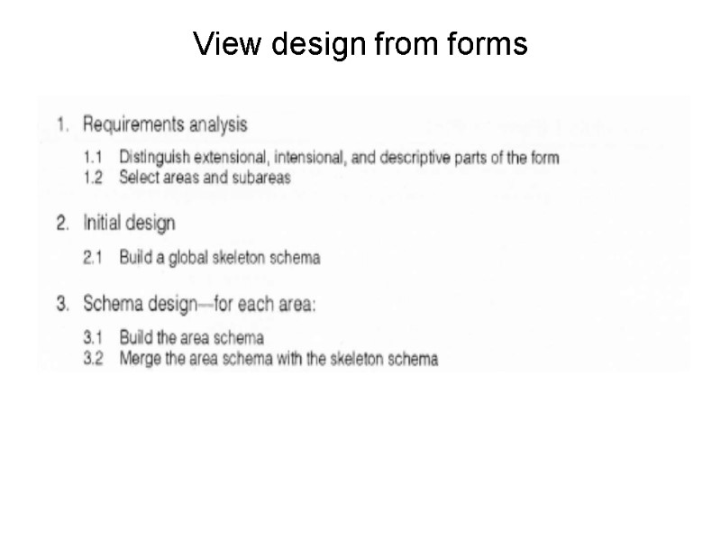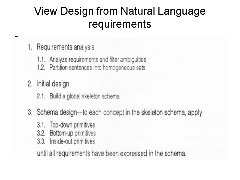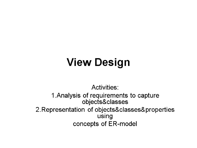 View Design Activities: 1.Analysis of requirements to capture objects&classes 2.Representation of objects&classes&properties using concepts of ER-model