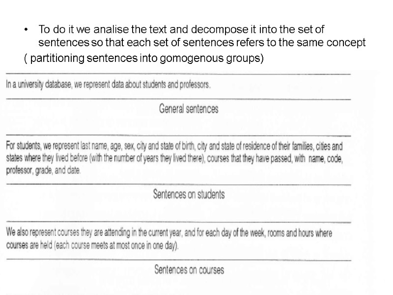 To do it we analise the text and decompose it into the set of sentences so that each set of sentences refers to the same concept ( partitioning sentences into gomogenous groups)