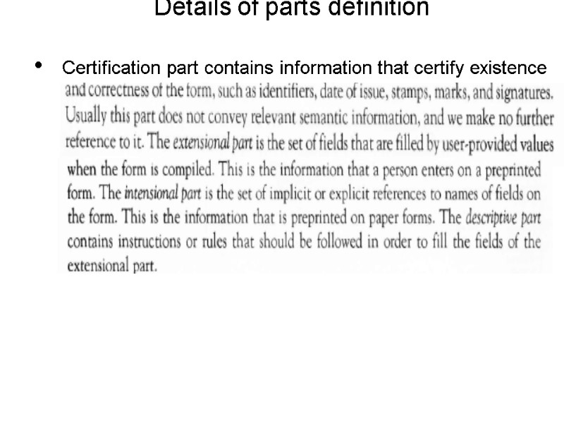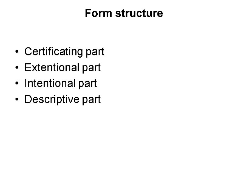 Form structure Certificating part Extentional part Intentional part Descriptive part