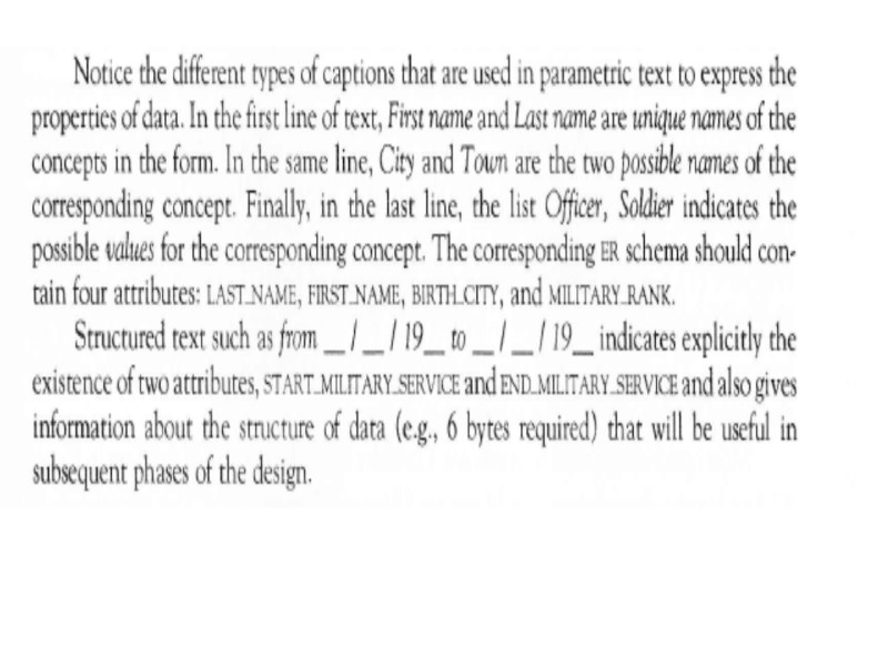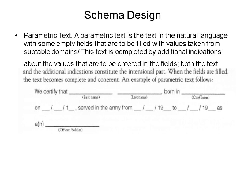 Schema Design Parametric Text. A parametric text is the text in the natural language with some empty fields that are to be filled with values taken from subtable domains/ This text is completed by additional indications about the values that are to be entered in the fields; both the text