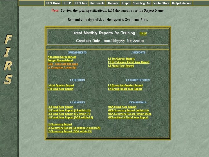 FIRS n n n Good for comparing similar operations, staffing, workload, population, budget, FTEs, etc. Can provide revenues and expenditures per program or Secondly can develop reports for a division (example, you can have separate budgets for the personnel department, finance and accounting, IT, etc. and you can also have a group report for all the offices).