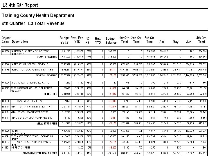 Financial Information Reporting System Developed a reporting system called FIRS n Easy reports to read in similar formats n Accessible via the DOH network n ¨ All you need is an email address ¨ Access the reports for your CHD or all CHDs within the state.