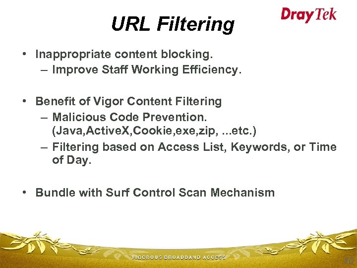 URL Filtering • Inappropriate content blocking. – Improve Staff Working Efficiency. • Benefit of Vigor Content Filtering – Malicious Code Prevention. (Java, Active. X, Cookie, exe, zip, . . . etc. ) – Filtering based on Access List, Keywords, or Time of Day. • Bundle with Surf Control Scan Mechanism 10