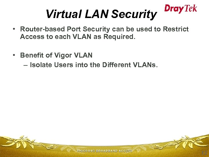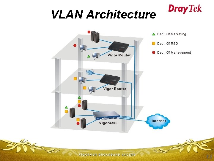 Virtual LAN Security • Router-based Port Security can be used to Restrict Access to each VLAN as Required. • Benefit of Vigor VLAN – Isolate Users into the Different VLANs. 12