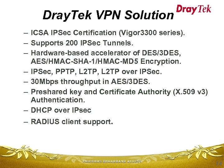 Dray. Tek VPN Solution – ICSA IPSec Certification (Vigor 3300 series). – Supports 200 IPSec Tunnels. – Hardware-based accelerator of DES/3 DES, AES/HMAC-SHA-1/HMAC-MD 5 Encryption. – IPSec, PPTP, L 2 TP over IPSec. – 30 Mbps throughput in AES/3 DES. – Preshared key and Certificate Authority (X. 509 v 3) Authentication. – DHCP over IPsec – RADIUS client support. 14