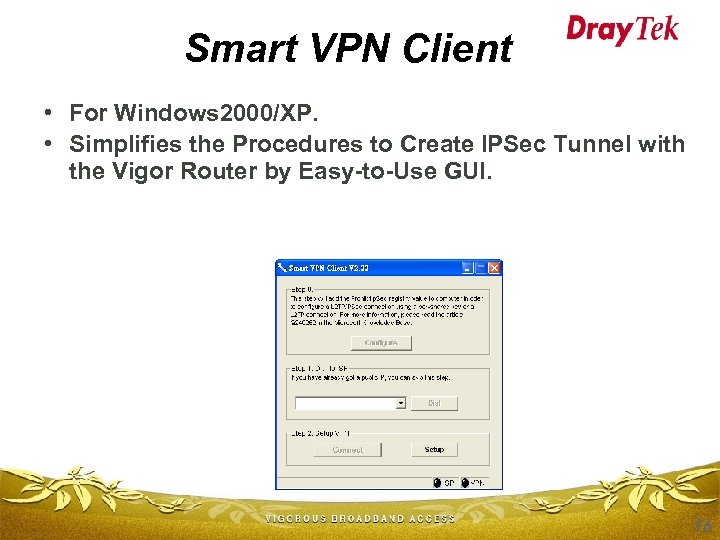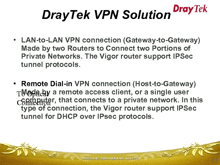 Dray. Tek VPN Solution • LAN-to-LAN VPN connection (Gateway-to-Gateway) Made by two Routers to Connect two Portions of Private Networks. The Vigor router support IPSec tunnel protocols. • Remote Dial-in VPN connection (Host-to-Gateway) Made by To Optical a remote access client, or a single user computer, Connection that connects to a private network. In this type of connection, the Vigor router support IPSec tunnel for DHCP over IPsec protocols. 15