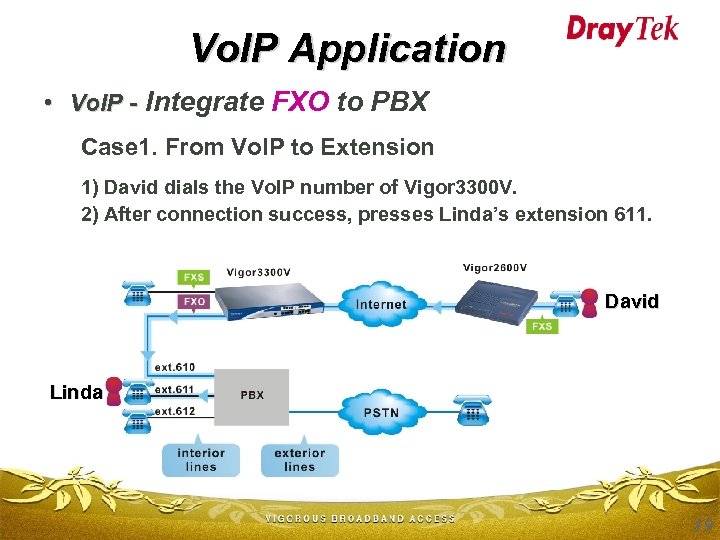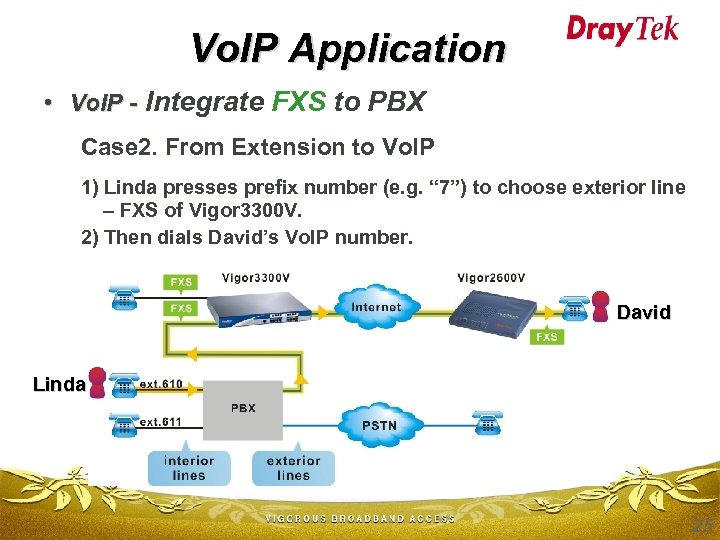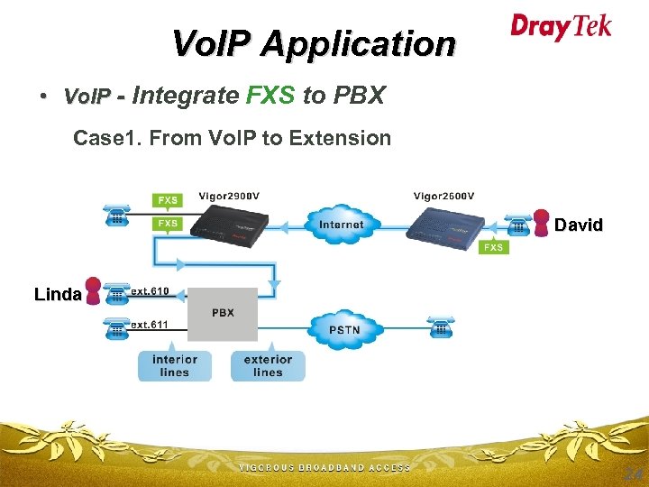 Vo. IP Application • Vo. IP - Integrate FXS to PBX Case 1. From Vo. IP to Extension David Linda 24