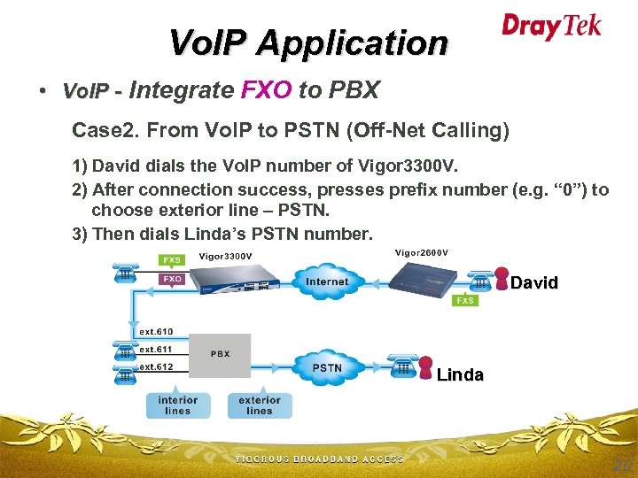 Vo. IP Application • Vo. IP - Integrate FXO to PBX Case 1. From Vo. IP to Extension 1) David dials the Vo. IP number of Vigor 3300 V. 2) After connection success, presses Linda’s extension 611. David Linda 19