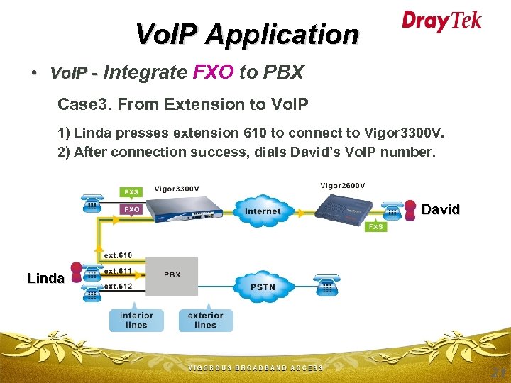 Vo. IP Application • Vo. IP - Integrate FXO to PBX Case 2. From Vo. IP to PSTN (Off-Net Calling) 1) David dials the Vo. IP number of Vigor 3300 V. 2) After connection success, presses prefix number (e. g. “ 0”) to choose exterior line – PSTN. 3) Then dials Linda’s PSTN number. David Linda 20