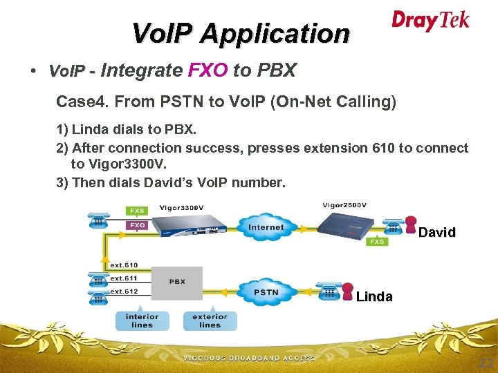 Vo. IP Application • Vo. IP - Integrate FXO to PBX Case 3. From Extension to Vo. IP 1) Linda presses extension 610 to connect to Vigor 3300 V. 2) After connection success, dials David’s Vo. IP number. David Linda 21