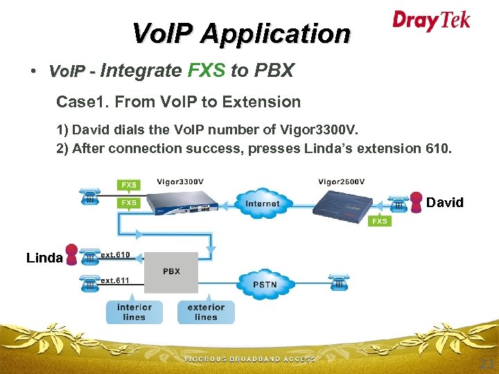 Vo. IP Application • Vo. IP - Integrate FXO to PBX Case 4. From PSTN to Vo. IP (On-Net Calling) 1) Linda dials to PBX. 2) After connection success, presses extension 610 to connect to Vigor 3300 V. 3) Then dials David’s Vo. IP number. David Linda 22