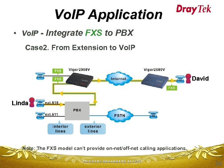 Vo. IP Application • Vo. IP - Integrate FXS to PBX Case 2. From Extension to Vo. IP 1) Linda presses prefix number (e. g. “ 7”) to choose exterior line – FXS of Vigor 3300 V. 2) Then dials David’s Vo. IP number. David Linda 25