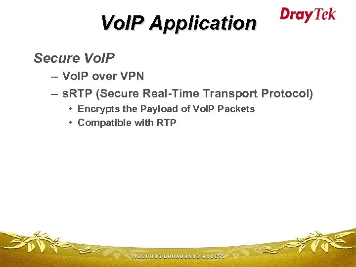 Vo. IP Application Secure Vo. IP – Vo. IP over VPN – s. RTP (Secure Real-Time Transport Protocol) • Encrypts the Payload of Vo. IP Packets • Compatible with RTP