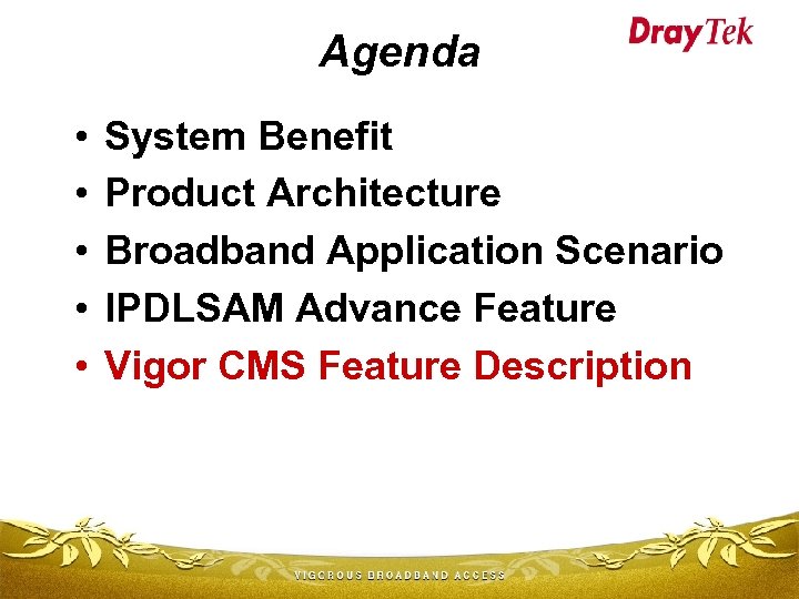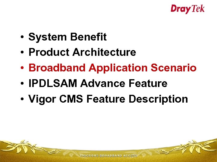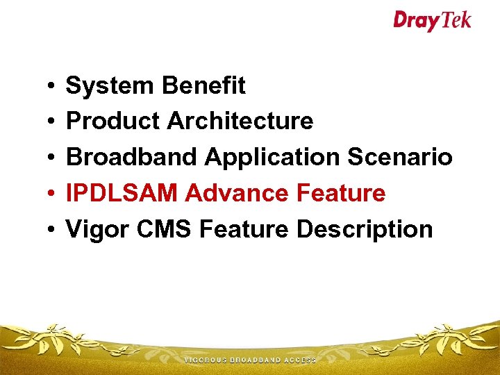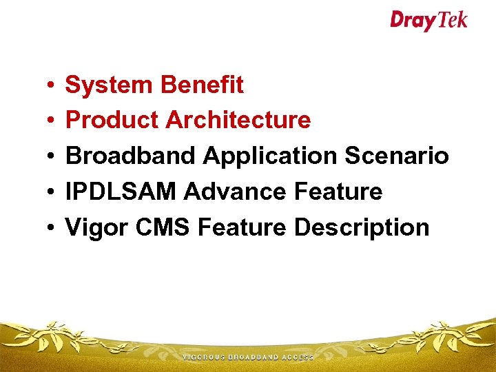Agenda • • • System Benefit Product Architecture Broadband Application Scenario IPDLSAM Advance Feature Vigor CMS Feature Description