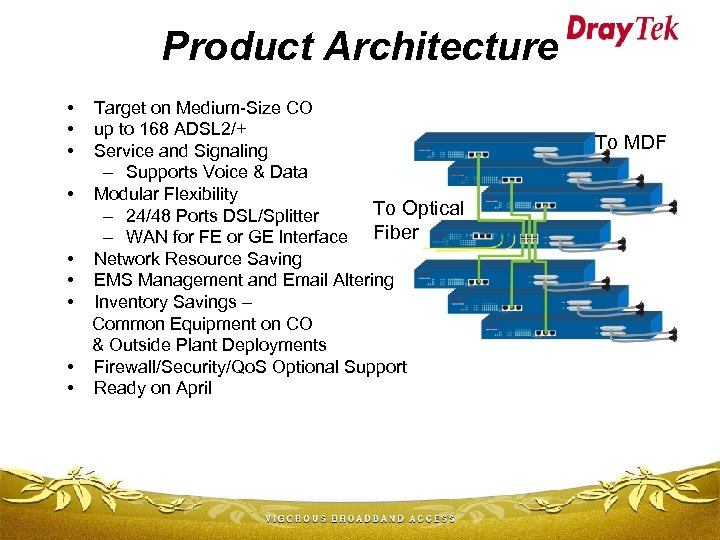 Product Architecture • • • Target on Medium-Size CO up to 168 ADSL 2/+ Service and Signaling – Supports Voice & Data • Modular Flexibility To Optical – 24/48 Ports DSL/Splitter – WAN for FE or GE Interface Fiber • Network Resource Saving • EMS Management and Email Altering • Inventory Savings – Common Equipment on CO & Outside Plant Deployments • Firewall/Security/Qo. S Optional Support • Ready on April To MDF