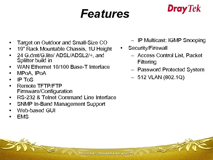 Features • • • Target on Outdoor and Small-Size CO 19” Rack Mountable Chassis, 1 U Height • 24 G. dmt/G. lite/ ADSL/ADSL 2/+, and Splitter build in WAN Ethernet 10/100 Base-T Interface MPo. A, IPo. A IP To. S Remote TFTP/FTP Firmware/Configuration RS-232 & Telnet Command Line Interface SNMP In-Band Management Support Web-based GUI EMS – IP Multicast: IGMP Snooping Security/Firewall – Access Control List, Packet Filtering – Password Protected System – 512 VLAN (802. 1 Q)