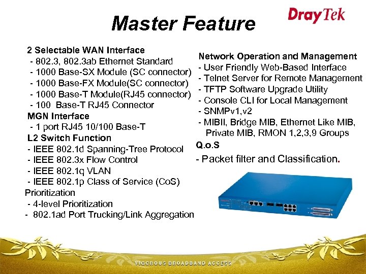 Master Feature 2 Selectable WAN Interface Network Operation and Management - 802. 3, 802. 3 ab Ethernet Standard - User Friendly Web-Based Interface - 1000 Base-SX Module (SC connector) - Telnet Server for Remote Management - 1000 Base-FX Module(SC connector) - TFTP Software Upgrade Utility - 1000 Base-T Module(RJ 45 connector) - Console CLI for Local Management - 100 Base-T RJ 45 Connector - SNMPv 1, v 2 MGN Interface - MIBII, Bridge MIB, Ethernet Like MIB, - 1 port RJ 45 10/100 Base-T Private MIB, RMON 1, 2, 3, 9 Groups L 2 Switch Function - IEEE 802. 1 d Spanning-Tree Protocol Q. o. S - Packet filter and Classification. - IEEE 802. 3 x Flow Control - IEEE 802. 1 q VLAN - IEEE 802. 1 p Class of Service (Co. S) Prioritization - 4 -level Prioritization - 802. 1 ad Port Trucking/Link Aggregation