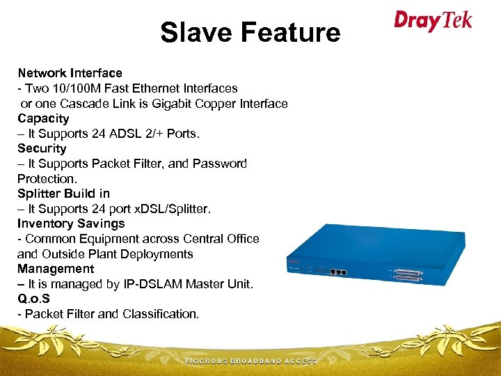 Slave Feature Network Interface - Two 10/100 M Fast Ethernet Interfaces or one Cascade Link is Gigabit Copper Interface Capacity – It Supports 24 ADSL 2/+ Ports. Security – It Supports Packet Filter, and Password Protection. Splitter Build in – It Supports 24 port x. DSL/Splitter. Inventory Savings - Common Equipment across Central Office and Outside Plant Deployments Management – It is managed by IP-DSLAM Master Unit. Q. o. S - Packet Filter and Classification.