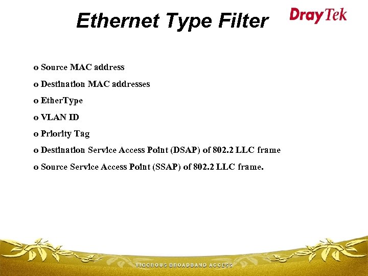 Ethernet Type Filter o Source MAC address o Destination MAC addresses o Ether. Type o VLAN ID o Priority Tag o Destination Service Access Point (DSAP) of 802. 2 LLC frame o Source Service Access Point (SSAP) of 802. 2 LLC frame.