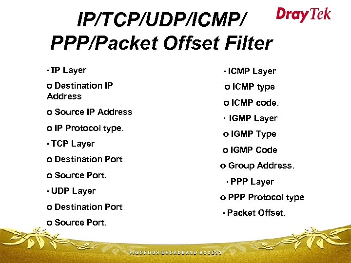 IP/TCP/UDP/ICMP/ PPP/Packet Offset Filter ‧ IP Layer ‧ ICMP Layer o Destination IP Address o ICMP type o Source IP Address o IP Protocol type. ‧ TCP Layer o Destination Port o Source Port. ‧ UDP Layer o Destination Port o Source Port. o ICMP code. ‧ IGMP Layer o IGMP Type o IGMP Code o Group Address. ‧ PPP Layer o PPP Protocol type ‧ Packet Offset.