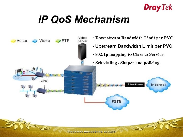 IP Qo. S Mechanism ‧ Downstream Bandwidth Limit per PVC ‧ Upstream Bandwidth Limit per PVC ‧ 802. 1 p mapping to Class to Service ‧ Scheduling , Shaper and policing