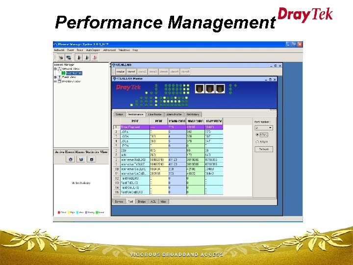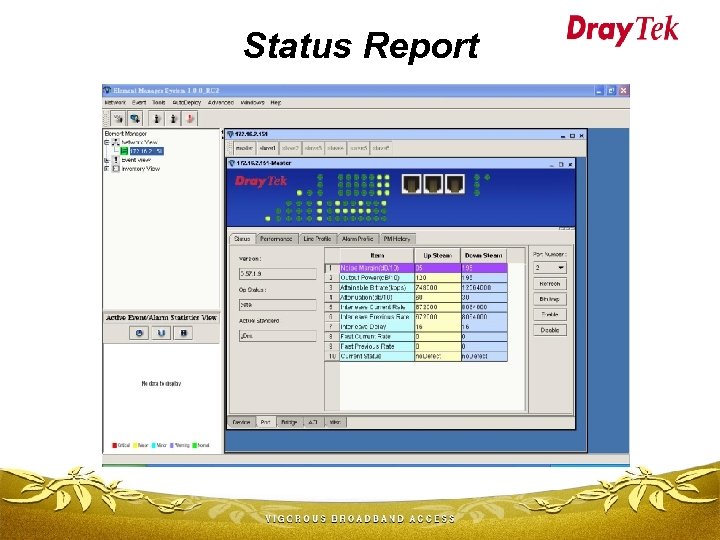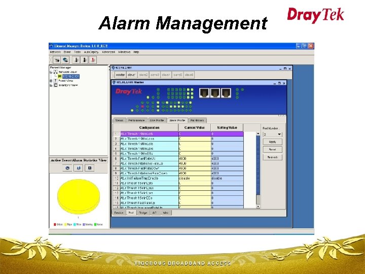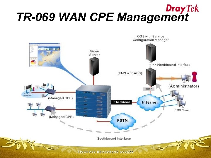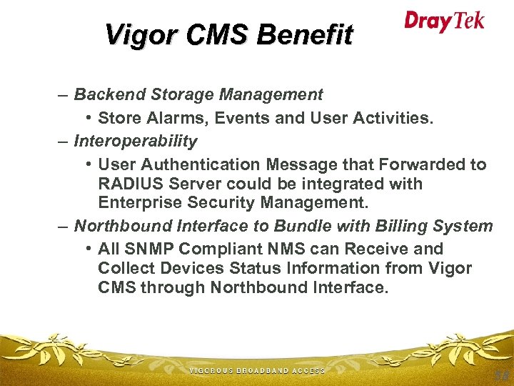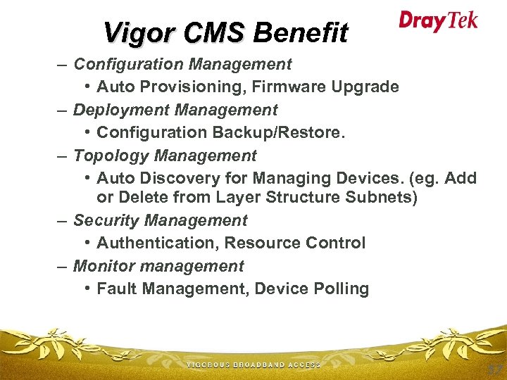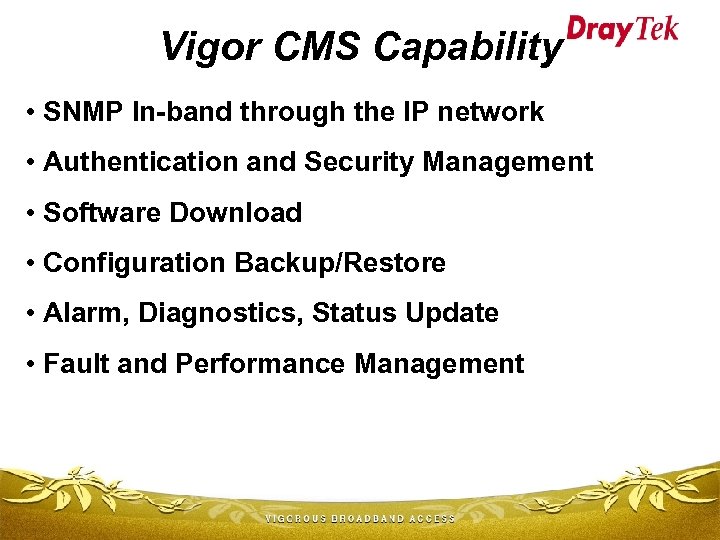 Vigor CMS Capability • SNMP In-band through the IP network • Authentication and Security Management • Software Download • Configuration Backup/Restore • Alarm, Diagnostics, Status Update • Fault and Performance Management