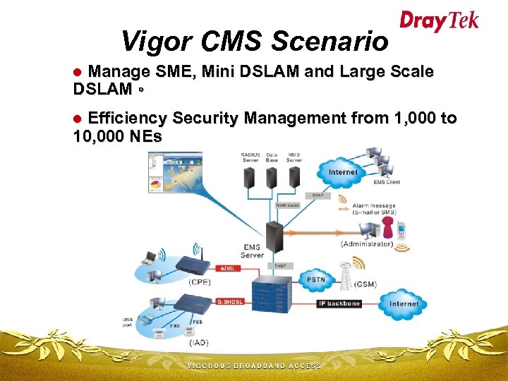 Vigor CMS Scenario Manage SME, Mini DSLAM and Large Scale DSLAM。 l Efficiency Security Management from 1, 000 to 10, 000 NEs l