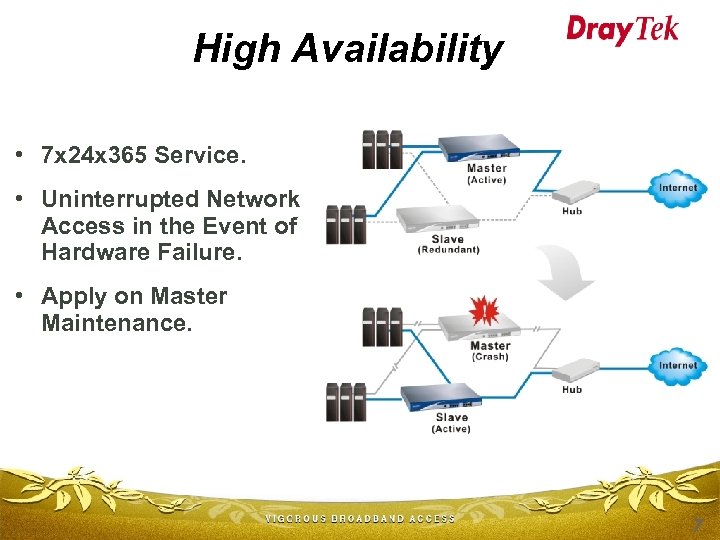 High Availability • 7 x 24 x 365 Service. • Uninterrupted Network Access in the Event of Hardware Failure. • Apply on Master Maintenance. 7