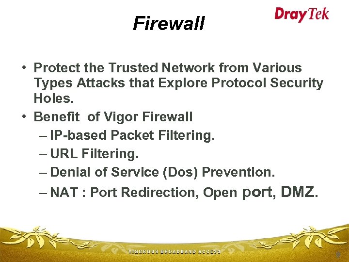 Firewall • Protect the Trusted Network from Various Types Attacks that Explore Protocol Security Holes. • Benefit of Vigor Firewall – IP-based Packet Filtering. – URL Filtering. – Denial of Service (Dos) Prevention. – NAT : Port Redirection, Open port, DMZ. 9