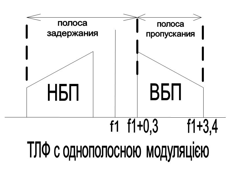 Телефонний радіосигнал з однополосною модуляцією -ТЛФ ОМ Первинний безперервний сигнал впливає на амплітуду та частоту ВЧ коливання. По структурі ці сигнали співпадають з верхніми (ВБ) та нижніми бічними (НБ) смугами ТЛФ АМ сигналу. Основний спосіб формування – фільтровий: виділення за допомогою фільтра однієї з бічних смуг ТЛФ АМ сигналу. Несуча подавлена частково або повністю, в більшості радіостанцій передбачена робота по ВБ, НБ та по двом одночасно ВБ+НБ (двоканальна робота), при цьому обидва канали можуть використовуватись для передачі однакової або різної інформації.