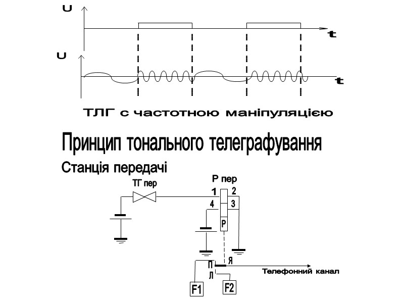 Телеграфний радіосигнал з частотною маніпуляцією або телеграфією - ТЛГ ЧТ (F1) Первинний дискретний сигнал впливає на частоту ВЧ коливання.