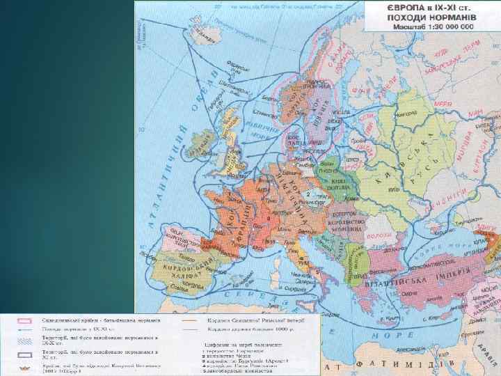 Походи вікігнів З 793 року вікінги почали нападати на Англію, здійснюючи свої розбійницькі набіги на міста і монастирі, увозячи з собою трофеї та рабів (у 878 році після поразки від англійського короля Альфреда ними було укладено договір про розподіл території Англії). У 10 столітті вікінги нападали також і на землі Франції. Так, наприклад, у 886 році вони навіть обложили Париж, але французький король Карл ІІ Лисий зумів від них відкупитися. Заселена вікінгами територія здобула назву Нормандія. Пізніше вікінги оселилися на землях Ісландіії та Гренландії. . Але жорстокі природно-кліматичні умови та неврожаї привели до загибелі вікінгської колонії в Гренландії. На півночі Європи вони досягли узбережжя Білого моря, на Заході і Південному Заході вони обігнувши Європу доплили до італійських міст Середземномор'я — Генуї та Венеції. На Сході вони спустилися Волгою через Каспій до берегів Персії і досить довгий час вели работоргівлю з персам і арабами. Південно. Східний напрямок експансії вікінгів по рікам Волхову та Дніпру до Візантії здобув назву «Путь з варяг у греки» . Данські вікінги в поході на Англію. (Мініатюра, «Житіє св. Едмунда» , 12 століття).