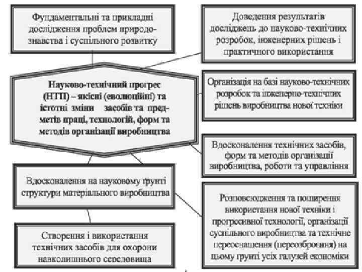 n НТП – основа науково-виробничого прогресу, що включає удосконалення виробництва в цілому, в тому числі робітника як головної виробничої сили, форм і методів управління, господарчого механізму. [6]