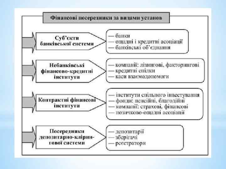 Діяльність фінансових посередників При обслуговуванні учасників ринку одні фінансові посередники надають лише окремий вид послуг, який і визначає в цілому їх роль на ринку, а інші — широкий спектр фінансових послуг (комерційні банки, які крім основних банківських послуг щодо залучення коштів та розміщення їх на ринку кредитів, здійснюють велику кількість операцій від імені та за рахунок клієнтів як на ринку позикових капіталів, так і на фондовому і валютному ринках) До спеціалізованих фінансових інститутів, які переважно займаються па ринку одним видом діяльності, належать страхові, інвестиційні компанії, брокерські фірми та ін. Так, інвестиційні компанії здійснюють діяльність зі спільного інвестування коштів інвесторів у дивер-сифікований портфель цінних паперів. Страхові компанії, укладаючи угоди страхування, приймають на себе певні ризики власників полісів, а залучені кошти інвестують у пайові та боргові цінні папери.