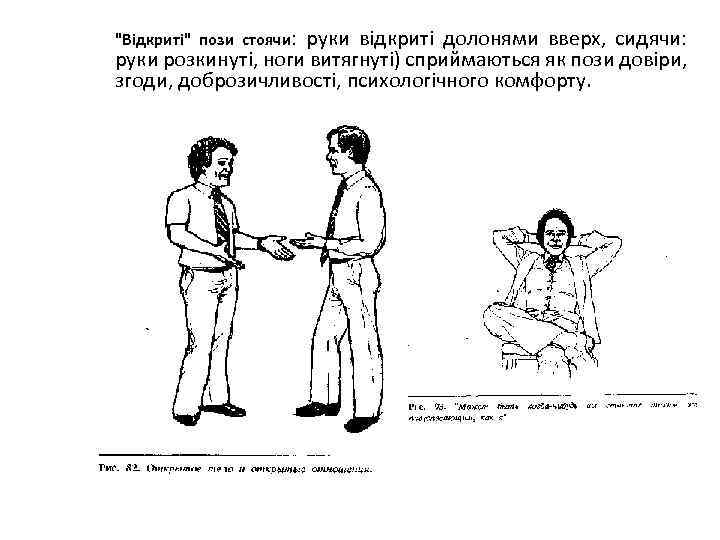 "Відкриті" пози стоячи: руки відкриті долонями вверх, сидячи: руки розкинуті, ноги витягнуті) сприймаються як пози довіри, згоди, доброзичливості, психологічного комфорту.