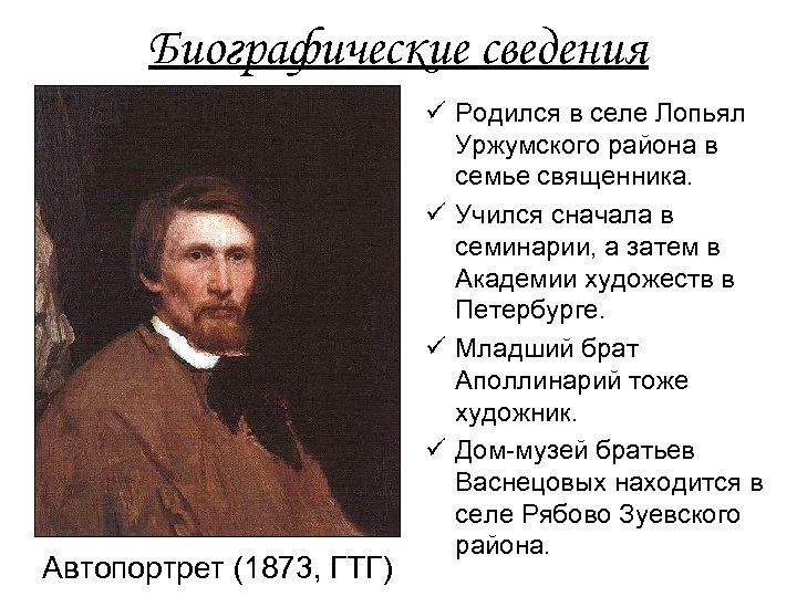 Биографические сведения Автопортрет (1873, ГТГ) ü Родился в селе Лопьял Уржумского района в семье священника. ü Учился сначала в семинарии, а затем в Академии художеств в Петербурге. ü Младший брат Аполлинарий тоже художник. ü Дом-музей братьев Васнецовых находится в селе Рябово Зуевского района.