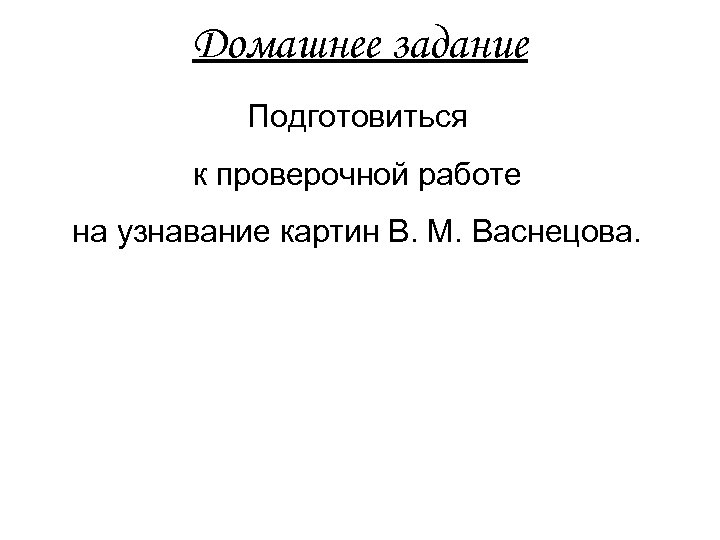 Домашнее задание Подготовиться к проверочной работе на узнавание картин В. М. Васнецова.