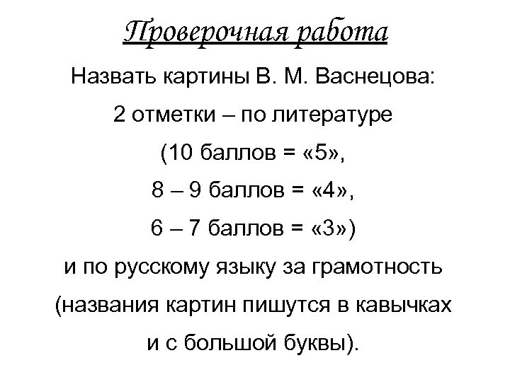 Проверочная работа Назвать картины В. М. Васнецова: 2 отметки – по литературе (10 баллов = « 5» , 8 – 9 баллов = « 4» , 6 – 7 баллов = « 3» ) и по русскому языку за грамотность (названия картин пишутся в кавычках и с большой буквы).