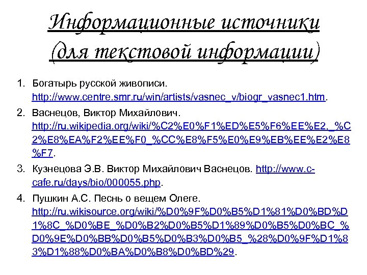 Информационные источники (для текстовой информации) 1. Богатырь русской живописи. http: //www. centre. smr. ru/win/artists/vasnec_v/biogr_vasnec 1. htm. 2. Васнецов, Виктор Михайлович. http: //ru. wikipedia. org/wiki/%C 2%E 0%F 1%ED%E 5%F 6%EE%E 2, _%C 2%E 8%EA%F 2%EE%F 0_%CC%E 8%F 5%E 0%E 9%EB%EE%E 2%E 8 %F 7. 3. Кузнецова Э. В. Виктор Михайлович Васнецов. http: //www. ccafe. ru/days/bio/000055. php. 4. Пушкин А. С. Песнь о вещем Олеге. http: //ru. wikisource. org/wiki/%D 0%9 F%D 0%B 5%D 1%81%D 0%BD%D 1%8 C_%D 0%BE_%D 0%B 2%D 0%B 5%D 1%89%D 0%B 5%D 0%BC_% D 0%9 E%D 0%BB%D 0%B 5%D 0%B 3%D 0%B 5_%28%D 0%9 F%D 1%8 3%D 1%88%D 0%BA%D 0%B 8%D 0%BD%29.