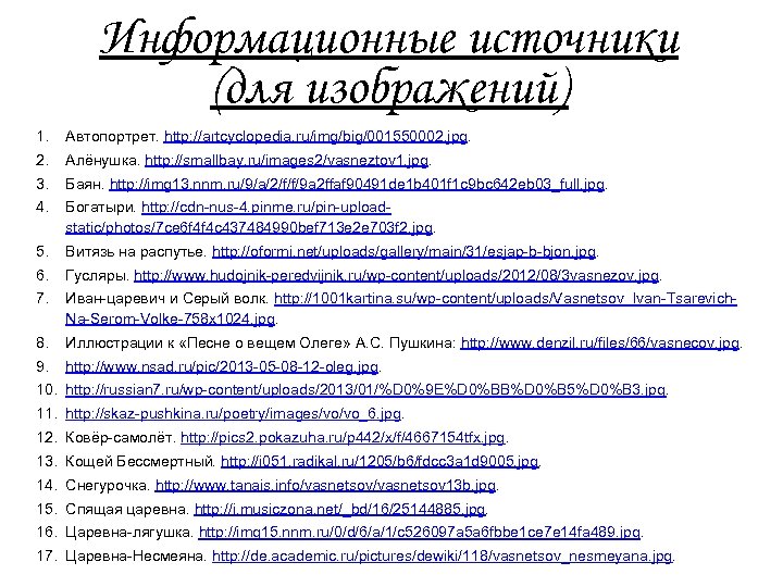 Информационные источники (для изображений) 1. Автопортрет. http: //artcyclopedia. ru/img/big/001550002. jpg. 2. Алёнушка. http: //smallbay. ru/images 2/vasneztov 1. jpg. 3. Баян. http: //img 13. nnm. ru/9/a/2/f/f/9 a 2 ffaf 90491 de 1 b 401 f 1 c 9 bc 642 eb 03_full. jpg. 4. Богатыри. http: //cdn-nus-4. pinme. ru/pin-uploadstatic/photos/7 ce 6 f 4 f 4 c 437484990 bef 713 e 2 e 703 f 2. jpg. 5. Витязь на распутье. http: //oformi. net/uploads/gallery/main/31/esjap-b-bjon. jpg. 6. Гусляры. http: //www. hudojnik-peredvijnik. ru/wp-content/uploads/2012/08/3 vasnezov. jpg. 7. Иван-царевич и Серый волк. http: //1001 kartina. su/wp-content/uploads/Vasnetsov_Ivan-Tsarevich. Na-Serom-Volke-758 x 1024. jpg. 8. Иллюстрации к «Песне о вещем Олеге» А. С. Пушкина: http: //www. denzil. ru/files/66/vasnecov. jpg. 9. http: //www. nsad. ru/pic/2013 -05 -08 -12 -oleg. jpg. 10. http: //russian 7. ru/wp-content/uploads/2013/01/%D 0%9 E%D 0%BB%D 0%B 5%D 0%B 3. jpg. 11. http: //skaz-pushkina. ru/poetry/images/vo/vo_6. jpg. 12. Ковёр-самолёт. http: //pics 2. pokazuha. ru/p 442/x/f/4667154 tfx. jpg. 13. Кощей Бессмертный. http: //i 051. radikal. ru/1205/b 6/fdcc 3 a 1 d 9005. jpg. 14. Снегурочка. http: //www. tanais. info/vasnetsov 13 b. jpg. 15. Спящая царевна. http: //i. musiczona. net/_bd/16/25144885. jpg. 16. Царевна-лягушка. http: //img 15. nnm. ru/0/d/6/a/1/c 526097 a 5 a 6 fbbe 1 ce 7 e 14 fa 489. jpg. 17. Царевна-Несмеяна. http: //de. academic. ru/pictures/dewiki/118/vasnetsov_nesmeyana. jpg.