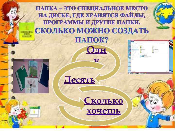 ПАПКА – ЭТО СПЕЦИАЛЬНОЕ МЕСТО НА ДИСКЕ, ГДЕ ХРАНЯТСЯ ФАЙЛЫ, ПРОГРАММЫ И ДРУГИЕ ПАПКИ. СКОЛЬКО МОЖНО СОЗДАТЬ ПАПОК? Одн у Десять Сколько хочешь
