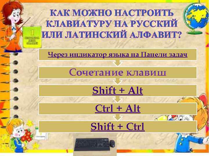 КАК МОЖНО НАСТРОИТЬ КЛАВИАТУРУ НА РУССКИЙ ИЛИ ЛАТИНСКИЙ АЛФАВИТ? Через индикатор языка на Панели задач Сочетание клавиш Shift + Alt Ctrl + Alt Shift + Ctrl