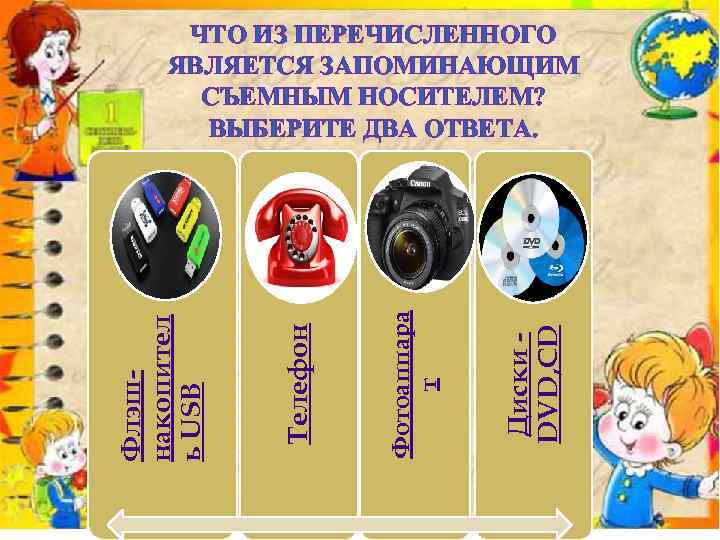 Диски DVD, CD Фотоаппара т Телефон Флэшнакопител ь USB ЧТО ИЗ ПЕРЕЧИСЛЕННОГО ЯВЛЯЕТСЯ ЗАПОМИНАЮЩИМ СЪЕМНЫМ НОСИТЕЛЕМ? ВЫБЕРИТЕ ДВА ОТВЕТА.