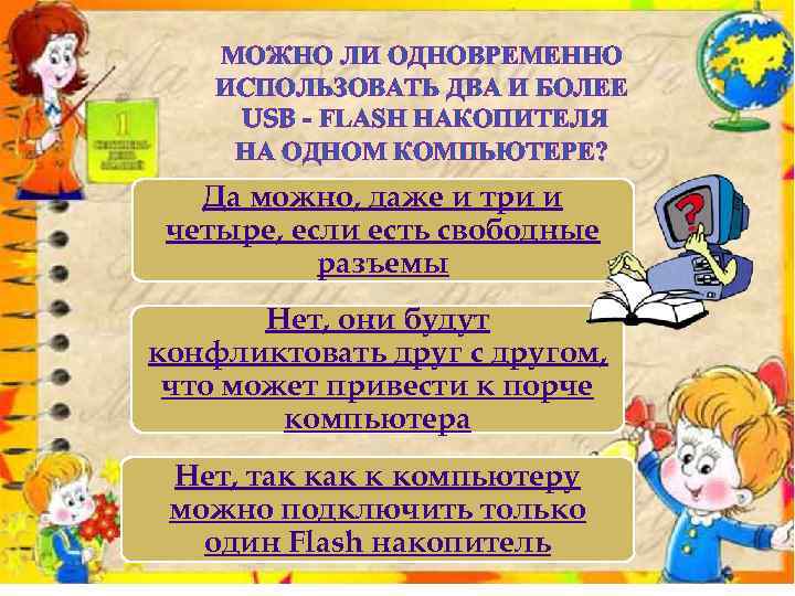 МОЖНО ЛИ ОДНОВРЕМЕННО ИСПОЛЬЗОВАТЬ ДВА И БОЛЕЕ USB - FLASH НАКОПИТЕЛЯ НА ОДНОМ КОМПЬЮТЕРЕ? Да можно, даже и три и четыре, если есть свободные разъемы Нет, они будут конфликтовать друг с другом, что может привести к порче компьютера Нет, так к компьютеру можно подключить только один Flash накопитель