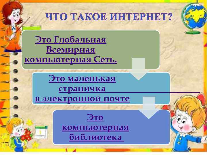 ЧТО ТАКОЕ ИНТЕРНЕТ? Это Глобальная Всемирная компьютерная Сеть. Это маленькая страничка в электронной почте Это компьютерная библиотека