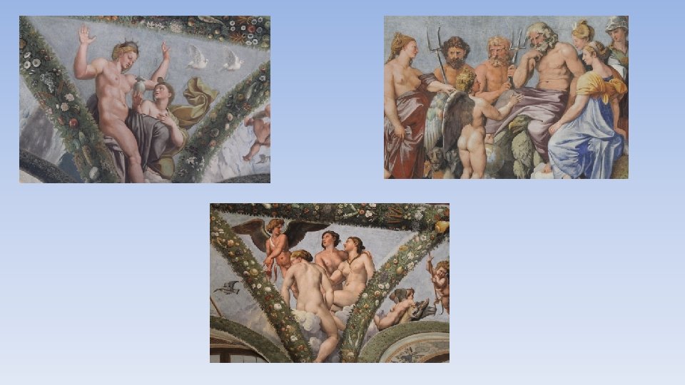 La Loggia di Amore e Psiche: Questa Loggia, attribuita a Raffaello ed alla sua scuola, vede raffigurata la storia di Amore e Psiche. Cinquecentesca però è solamente la volta, le pareti, infatti, che dovevano raffigurare le peripezie terrene di Psiche, non furono completate, ed ora rappresentano dei trompe l’oeil. The Loggia of Cupid and Psyche: In this Loggia, frescoed by Raphael and his school, is painted the love story of Cupid and Psyche. Just the vault was painted in fifteenth century, infact, the walls have been decorated in sixteenth century and represent some pseudoarchitectural elements.